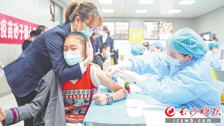 老师用双手护住正在接种新冠疫苗的学生,安抚其紧张情绪。 长沙晚报全媒体记者 易亿 摄