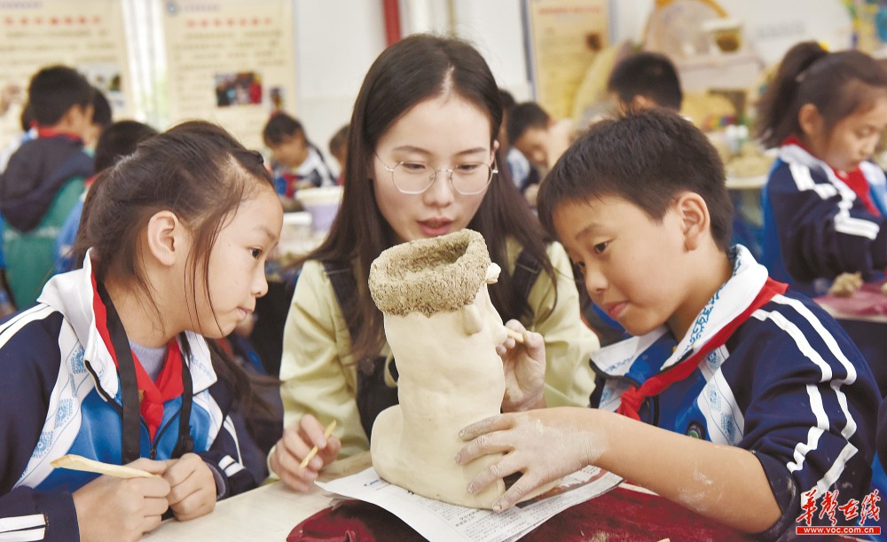 上图:11月3日,吉首市乾元小学民族文化实践工作坊,老师在指导学生制作湘西土陶作品。自“双减”政策实施以来,该校不断拓展课后服务的内容形式,相继开设踏虎凿花、湘西苗画、湘西土陶等民族传统特色工艺兴趣课程,受到学生追捧。姚方 吴拥华 摄影报道