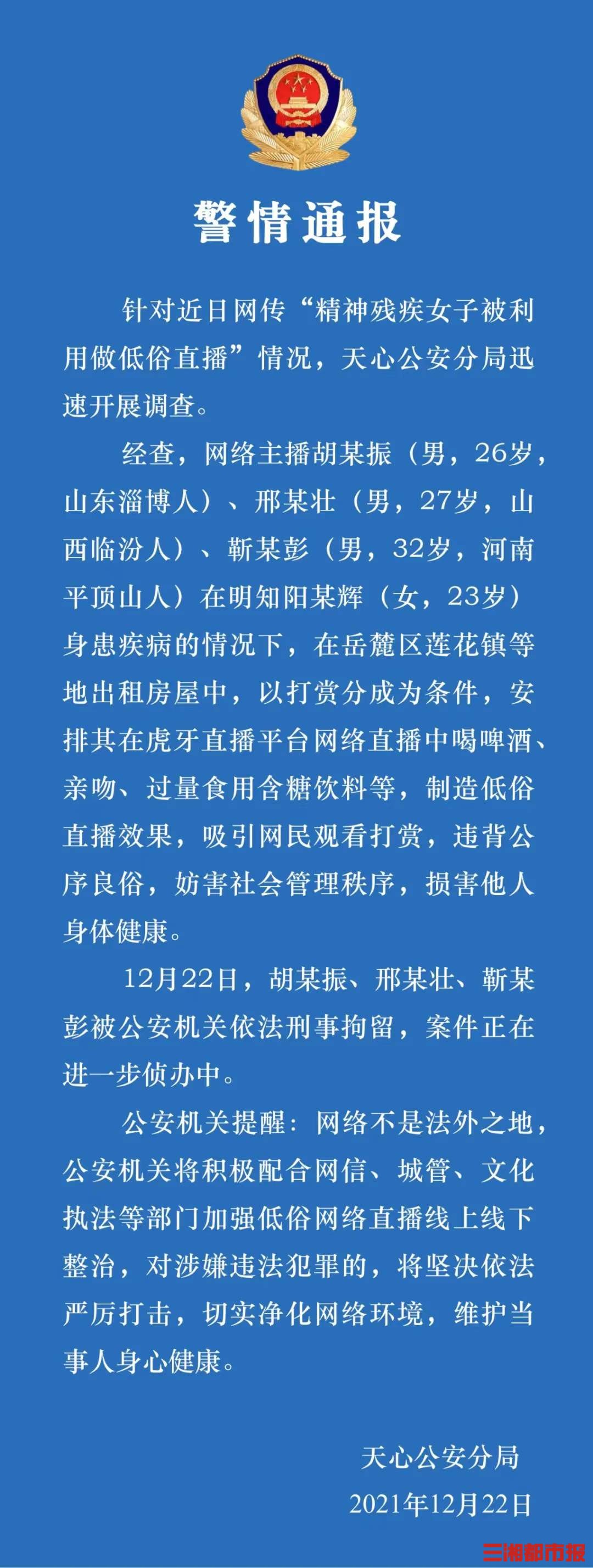 三湘都市报·华声在线12月22日讯(全媒体记者 杨洁规)今日晚间,长沙市公安局天心分局发布通报。针对近日网传“精神残疾女子被利用做低俗直播”情况,天心公安分局迅速开展调查。