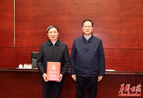 (毛伟明为湖南制造强省建设专家咨询委员会名誉主任委员黄伯云颁发聘书。)