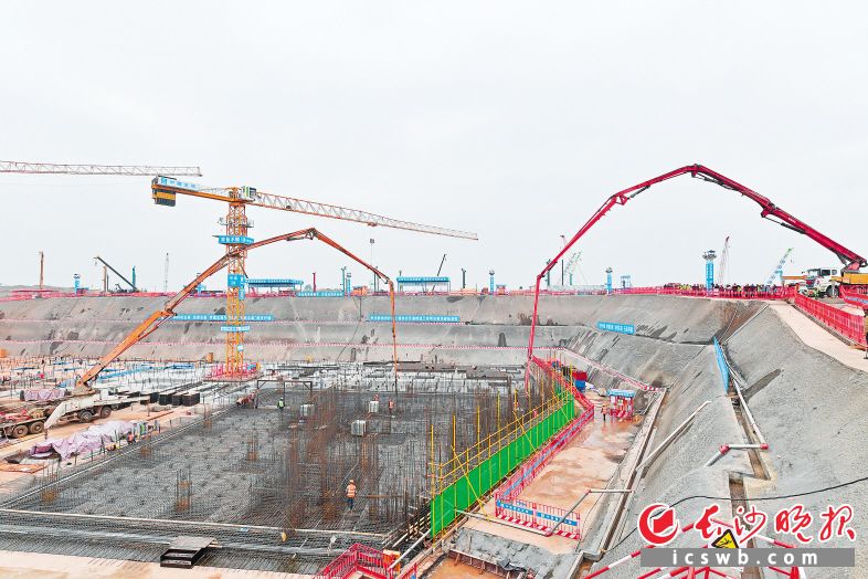 14日,长沙机场改扩建工程综合交通枢纽工程项目首块底板开始浇筑。 长沙晚报全媒体记者 王志伟 摄
