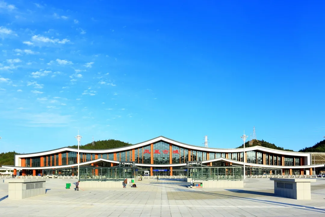 凤凰古城站,将凤凰起伏的群山、沱江边的吊脚楼、延绵的坡屋面等元素相结合,营造别有特色的建筑风格。车站候车厅整体深化构思以“灵秀山水 凤舞湘西”为主题。通过对山水、凤凰纹饰、传统民居建筑元素的提取、简化、运用,体现文化性和地方特色。