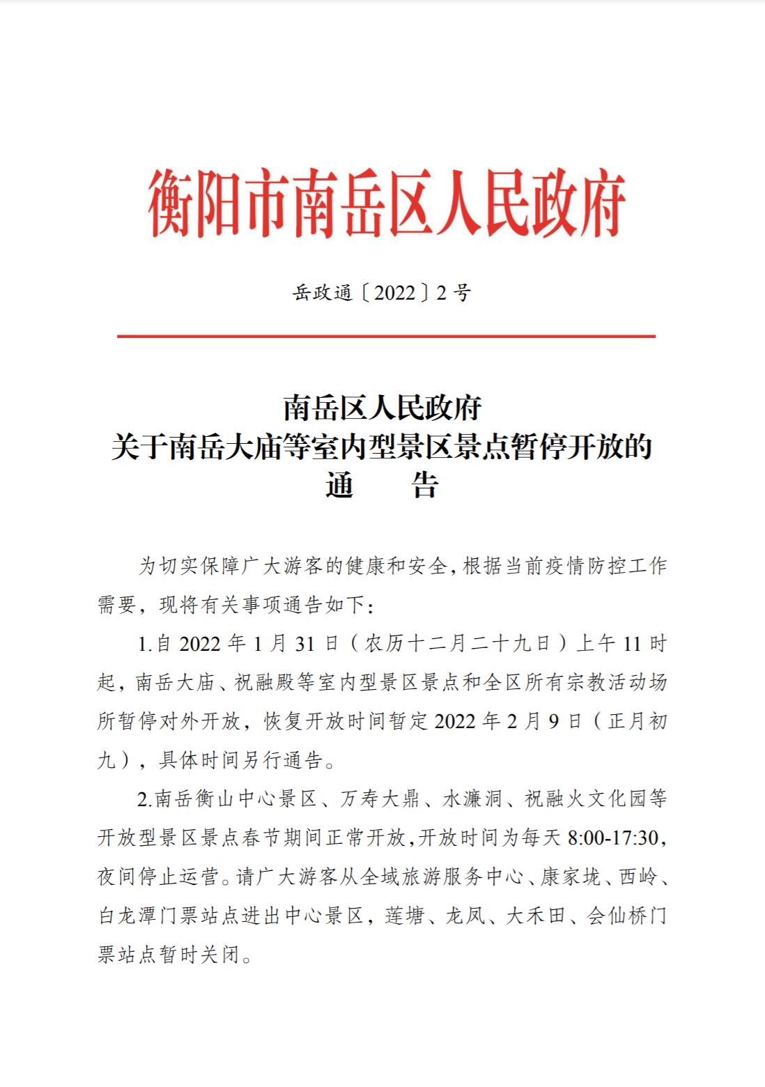 湖南日报·华声在线1月24日讯(通讯员 文兰 记者 聂沛)记者今天从衡阳市南岳区人民政府获悉,2022年1月31日(农历十二月二十九日)上午11时起,南岳大庙、祝融殿等室内型景区景点及全区所有宗教活动场所暂停对外开放,恢复开放时间暂定2022年2月9日(正月初九),具体时间另行通知;南岳衡山中心景区、水濂洞、万寿大鼎、祝融火文化园等室外型景区景点春节期间正常开放,每天开放时间为8:00至17:30。