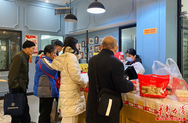 店里的工作人员一边忙着打点货物,一边向记者介绍道:“快过年了,现在每天都这么多人,客流量比平时多了好几倍,我们忙都忙不赢呢!像这款八宝年糕,里面放了红枣、冬瓜糖、枸杞、葡萄干等多种食材,是春节期间特有产品,卖得最好,基本人手一份……”家住附近的郑忠详买了6大包八宝年糕,打算作为新年礼物送给自己的“棋友”,他笑着说:“我们都喜欢这个味!”除此之外,店里的黑酥糖、桃酥、灯芯糕、雪枣等亦颇受消费者欢迎。