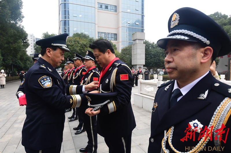 升旗仪式后,省公安厅为10名从警30周年“湖南公安荣誉章”受奖代表颁发了荣誉章。