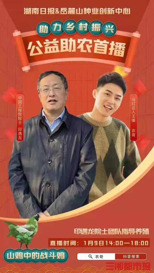 三湘都市报·华声在线1月8日讯 (全媒体记者 黄亚苹 刘品贝)1月9日,中国工程院院士印遇龙将与湖南头部主播“衣哥”梦幻联动,一同为邵阳县罗城乡保和村的“保和鸡”代言。