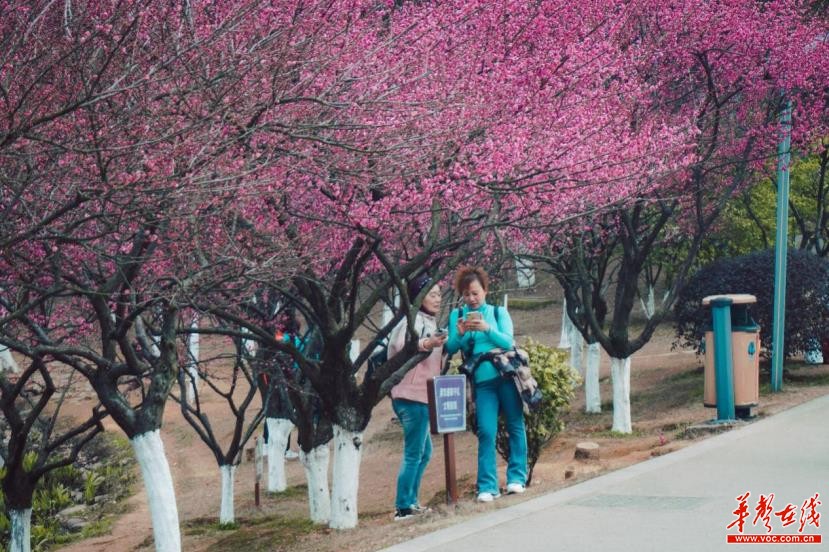(湖南省森林植物园的梅花主要分布在樱花湖畔、樱花大道、竹园、樱花园等核心景区。樱花湖西侧的山坡上有一大片梅花绽放,吸引了不少来赏花的市民。 记者周浩洋 摄)