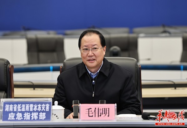 湖南日报2月22日讯(全媒体记者 孙敏坚) 22日下午,省委副书记、省长毛伟明赴省应急管理厅,紧急视频调度应对本轮低温雨雪冰冻天气。毛伟明强调,要牢固树立以人民为中心的发展思想,全力以赴做好应对处置工作,切实保障人民群众生命财产安全和生产生活正常秩序,坚决打好本轮低温雨雪冰冻灾害阻击战。