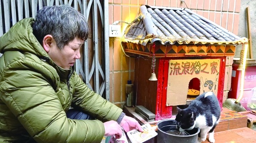 2月16日,长沙热心大姐在为流浪猫喂食。