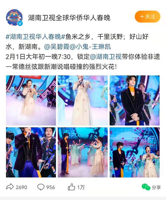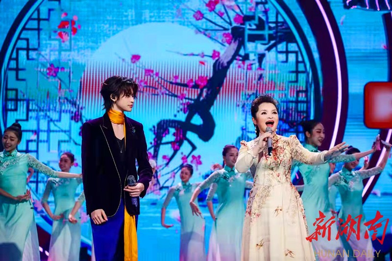 2月1日晚,在2022湖南卫视全球华侨华人春晚上,花腔女高音歌唱家吴碧霞与歌手小鬼——王琳凯携手演绎《湖南YOUNG》,把国家级非物质文化遗产常德丝弦与新潮时尚的说唱Rap,创新融合,用年轻人喜闻乐见的方式赋予传统文化新的活力,唱尽湖湘文化,唱响精彩湖南。