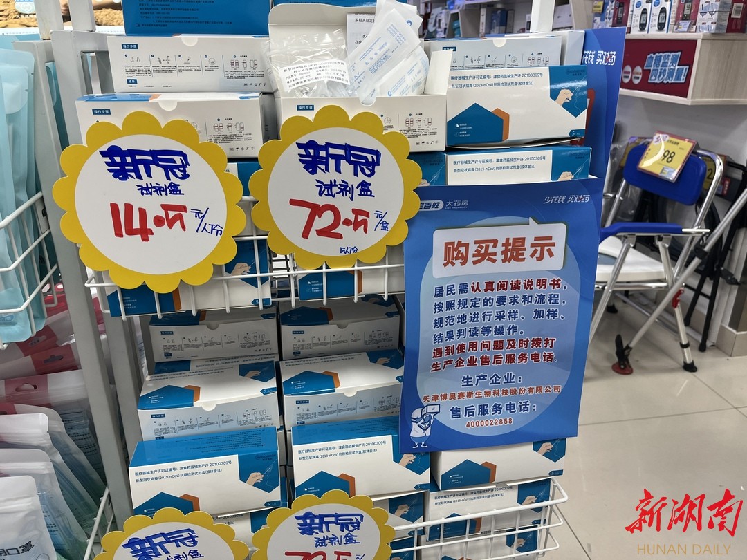 此次上架的新型冠状病毒(2019-nCoV)抗原检测试剂盒(胶体金法)由天津博奥赛斯生物科技股份有限公司生产,第一批新冠抗原检测产品经过质量验收,已经摆上公司位于长沙门店的货架进行销售。消费者购买后,按照说明书进行操作,15分钟快速出结果。