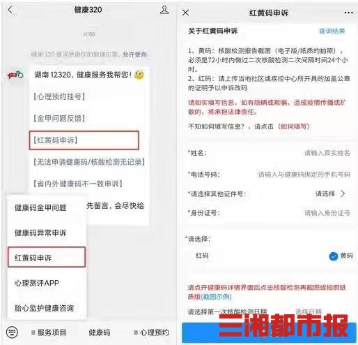 第二步,点击左下角“服务项目”中的“红黄码申诉”或者点击回复中的“红黄码申诉”,填写正确的个人信息以及“三天两检”(72小时内两次核酸检测证明,且两次监测时间间隔在24小时以上)核酸检测截图。红码人员还需提供上传当地疾控部门盖公章证明。