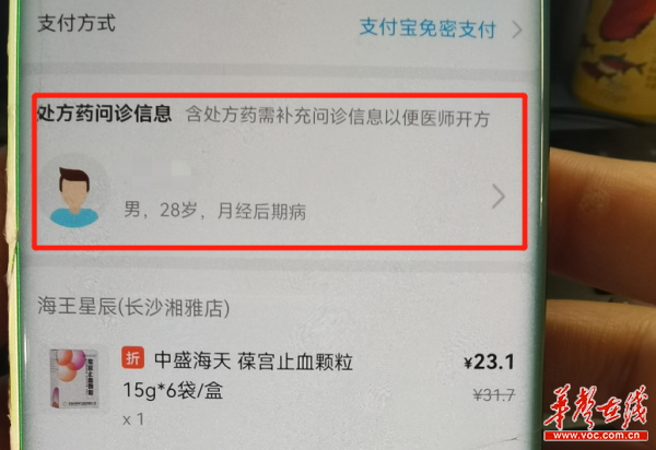 为进一步验证,记者请一位男性同事在“饿了么”平台注册认证,并在海王星辰(长沙湘雅店)药房下单一盒“葆宫止血颗粒”。由于该药属于妇科类处方用药,按平台要求,需提交问诊信息,记者这位同事随意选取“月经后期病”后,便跳出付款窗口。