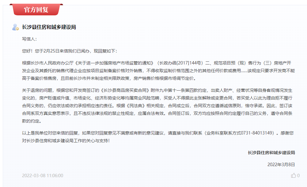 3月8日,长沙县住房和城乡建设局对此回复称:根据长沙市政府办公厅相关规定,只要求开发商不能高于备案价格售房,且目前长沙市并未制定相关限跌政策,房产销售价格根据市场调节定价。