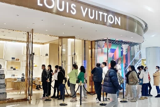 3月6日,在长沙国金中心的LV门店前,等待入店的市民有序地排着长队,而店内也是热闹非凡,销售人员在忙着为顾客展示商品。
