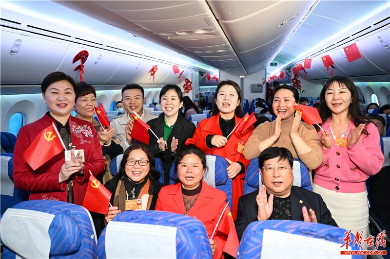 3月3日,赴京出席十三届全国人大五次会议的湖南代表团部分代表在机舱内同唱《一起向未来》。湖南日报全媒体记者 唐俊 赵持 摄