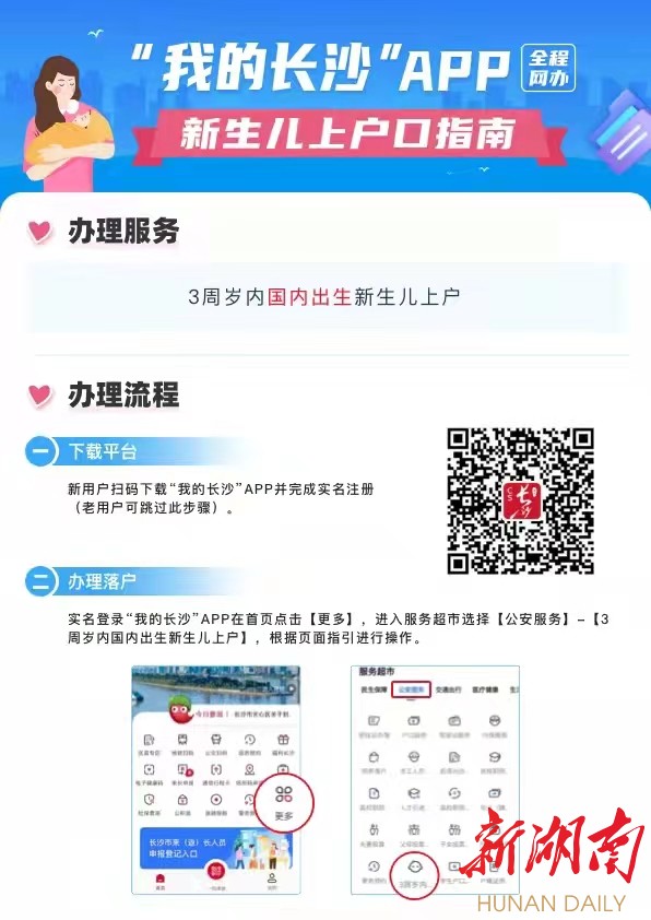 湖南日报·华声在线4月21日讯(记者 张福芳 通讯员 曾利)“通过‘我的长沙’APP,不到五分钟办好了我崽的新生儿落户,户口页还可以直接邮寄到家,实在是太方便了!”日前,在长沙市妇幼保健院刚刚喜迎家庭新成员的刘先生开心地告诉记者,他儿子昨天呱呱坠地,全家人忙得不亦乐乎,正愁不知道该去哪儿给孩子上户,就在大厅看见了“我的长沙”APP线上办理“新生儿落户”的指南,根据指南进行操作,他迅速为儿子办好了落户。