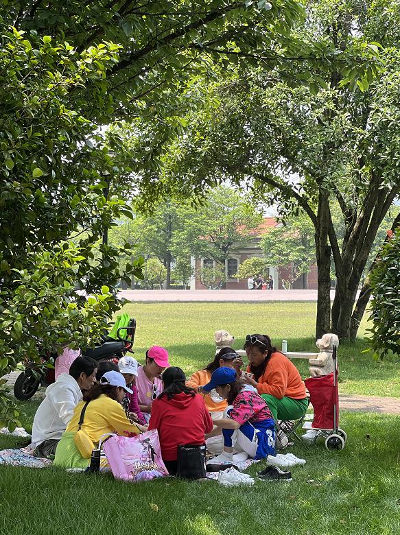 不远处,一群叔叔阿姨在草地上席地而坐,垫子上放着的都是他们各自带过来的美食,红烧肉、鸡爪、鱼块、小炒香干……很是丰富。" 我的菜不吃啊?"" 你拿过来呀 "" 你把菜拿出来噻 ",交谈中得知,这 9 位平均年龄已超过 60 岁的叔叔阿姨们都是同学,其中认识最久的已有 54 年时间。