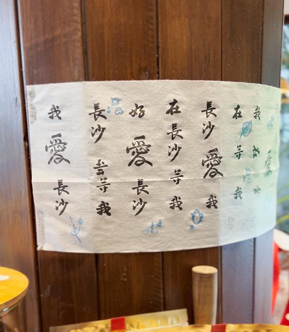 店内一根柱子上,贴着一副字画,上面写着 " 我爱长沙,在长沙等我 "。