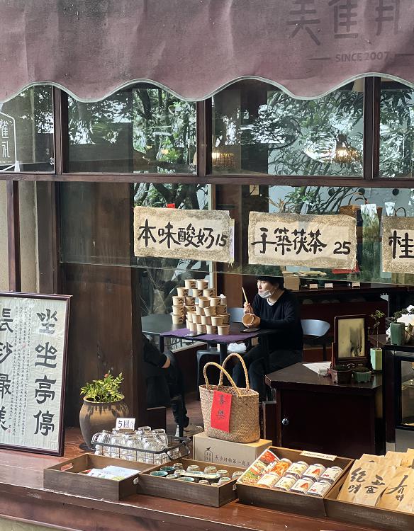 从岳麓山下乘坐索道慢慢往上,整个长沙似乎都在我的脚下。山顶一家文创店内,店主肖女士正拿着毛笔,在每个酸奶盒上写下 " 本味 " 二字。墙上、包装上、店里随处可见毛笔字的痕迹,肖女士说,这些都是自己和另一位姐姐一起写的," 包装都是我们自己设计,字也都是我们自己写。" 每个角落似乎都包含着她们的爱。