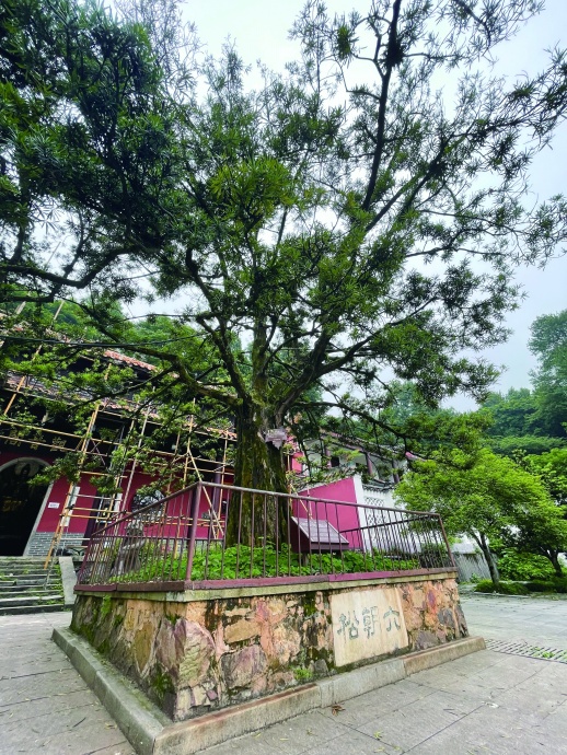 在长沙市岳麓山麓山寺观音阁前,有一棵湖南最美古罗汉松——六朝松,相传为六朝(南北朝)时所植,是岳麓山植物界中的“元老”,距今已有1740余年历史,也是长沙市最年长的古树。目前,寺庙正处于修缮期间,暂不对外开放。5月19日,三湘都市报记者来到麓山寺,在景区工作人员的带领下见到了这棵“六朝松”。