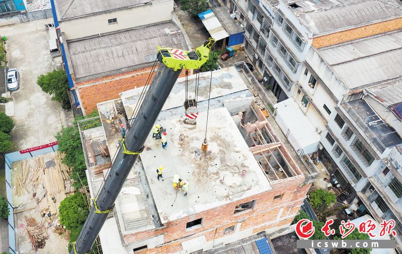长沙晚报5月18日讯(全媒体记者 朱华)18日,望城区乌山街道仁和社区茅花塘重建地,一栋居民自建房楼顶上,头戴黄色安全帽的工友正在忙碌,楼下一辆黄色起重机发出轰鸣声,相互配合有序开展拆违工作。望城区委书记秦国良,望城区委副书记、区长孔令强一行实地进行督导,并接受了本报记者采访。