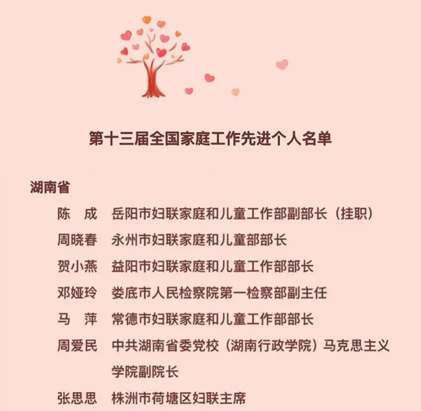 华声在线5月16日讯(通讯员 肖文婕)5月15日,是国际家庭日,全国妇联表彰第十三届全国五好家庭暨家庭工作先进集体、先进个人,揭晓2022年全国最美家庭。其中,来自湖南的黄木春家庭等33户家庭获得“第十三届全国五好家庭”称号,王志刚家庭等34户家庭获得“2022年全国最美家庭”称号。湘潭市妇联等7个集体获得“第十三届全国家庭工作先进集体”称号,陈成等7人获得“第十三届全国家庭工作先进个人”称号。