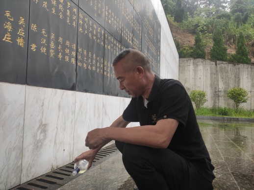 ▲5月11日,娄底涟源市烈士纪念园,廖正根带着儿女来英烈墙祭奠。