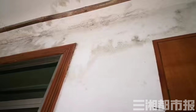80多平方米的屋子,原本是三室一厅一厨一卫。在王女士的引领下,记者看到,阳台、卧室等多处的天花板明显被水浸渍过,有明显的裂痕,以及成块状的黑色霉斑。