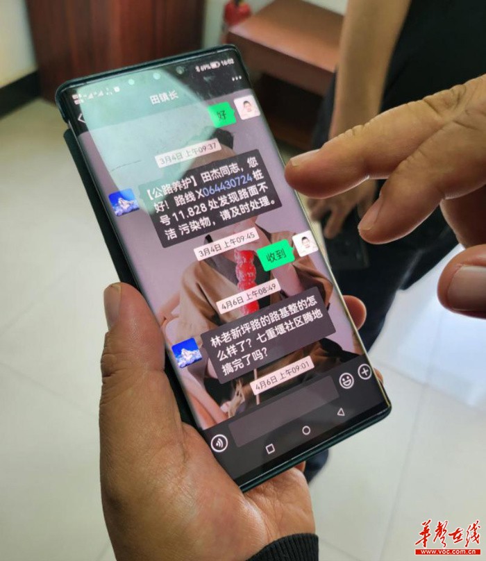“您好!路线S2374300000桩号145.465处发现路面不洁污染物,请及时处理”“林老新坪路的路基整得怎么样了?七重堰社区腾地搞完了吗”……修梅镇公路养护办主任谌勇指着手机里的一条条信息告诉记者,作为全镇总路长,田杰每天都会给他发送、交流这些公路养护信息。