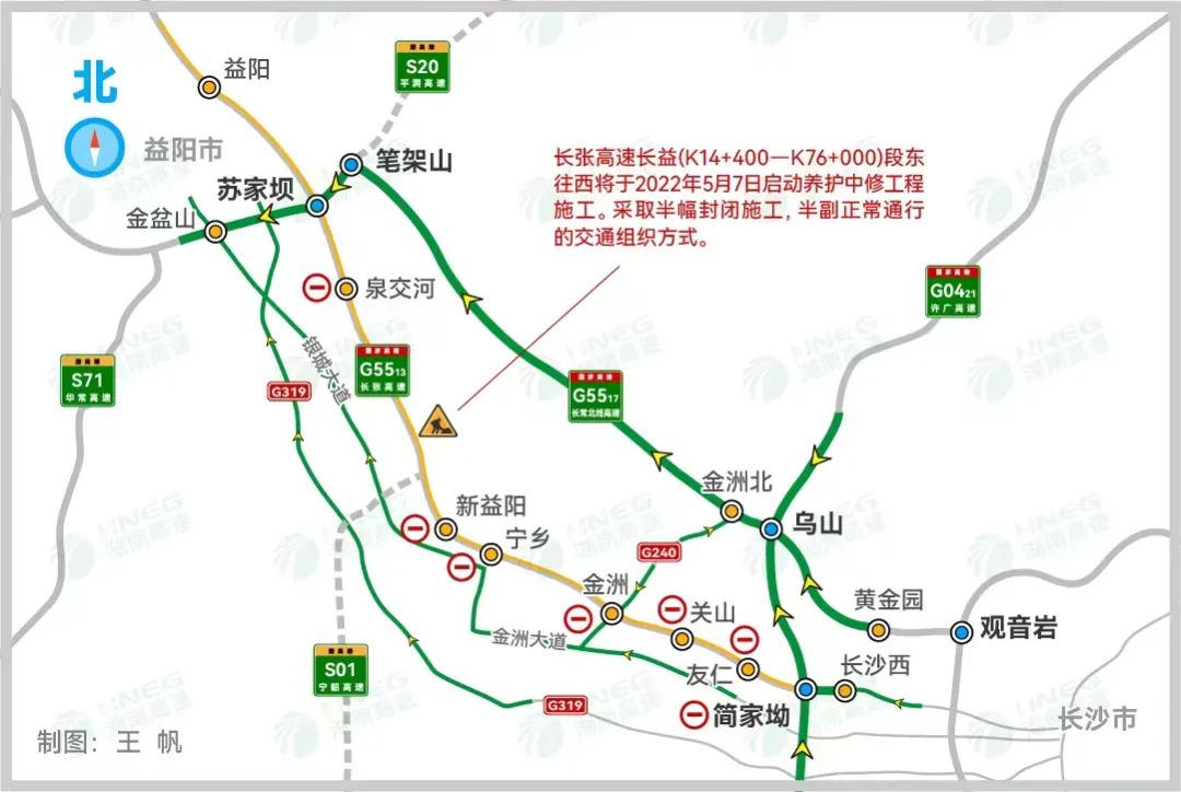 5月1日,G5513长张高速长沙到益阳段东往西半幅高速主线将启动养护中修工程施工,改善长张高速公路路面状况,该路段将实施临时交通管制。