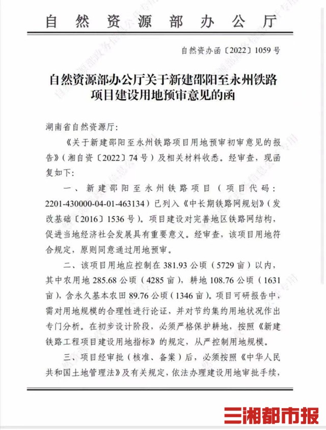 华声在线6月24日讯(全媒体记者 潘显璇)记者今日从湖南省自然资源厅获悉,邵阳至永州高铁、常益长铁路与武广高铁直通线、浩吉铁路岳阳港区铁路专用线工程3个项目的用地预审,已获得自然资源部批复。这一重大进展,为项目可研和初步设计方案的批复创造了重要前置条件,也为项目早日开工建设奠定了基础。3条铁路项目的建设,对完善国家铁路网络,带动沿线经济社会发展具有重要意义。