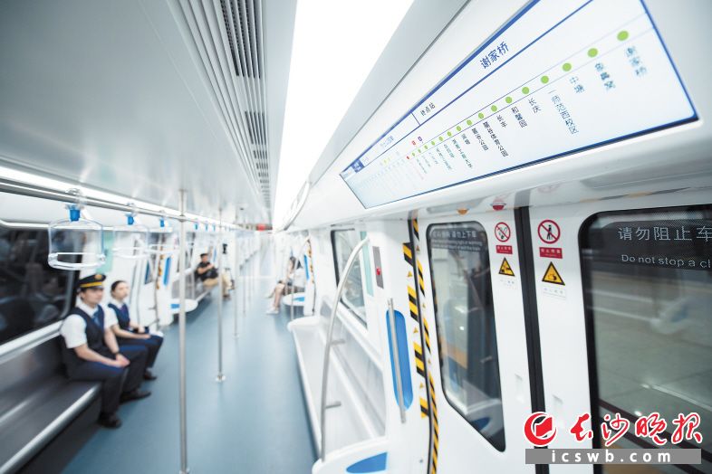眼下,地铁6号线各车站和列车正在为即将到来的载客初期运营做最后的准备。记者踏上一列由西往东的6号线列车。随行工作人员介绍,地铁6号线在长沙地铁线路中首次采用A型车制式,采用6节编组,车体相对传统的B型车更长更宽,载客量提升约20%,最大载客量为2592人/列。
