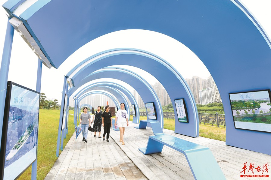 6月13日,市民在参观长沙市岳麓区靳江河水文化长廊。岳麓区在靳江河风光带(洋湖湿地公园段)打造的水文化长廊,以蓝色为主色调,以水花、浪花和波浪线条为造型,展示了水文化历史、河长制与水资源、防汛等科普知识。
