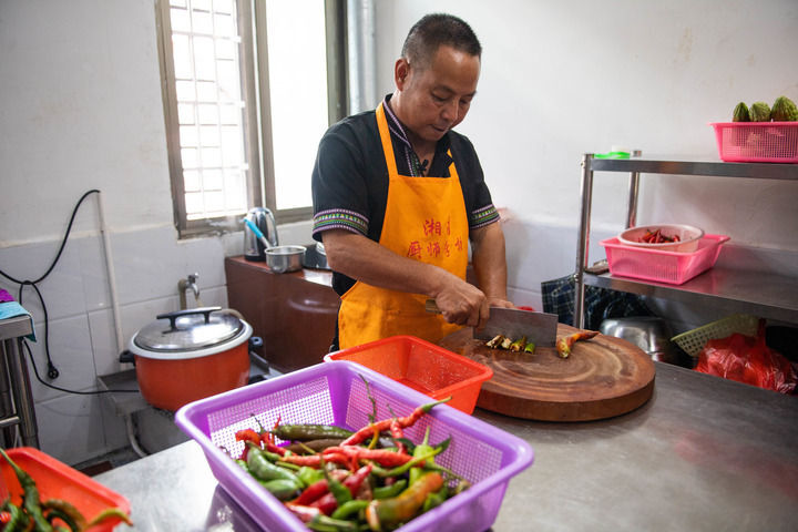 2020年9月17日,在汝城县沙洲瑶族村,朱小红在自家开的农家乐厨房里切菜。新华社记者 陈思汗 摄