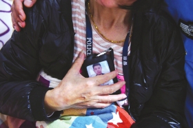 5月8日,衡阳常宁,王翠凤拿着儿子生前佩戴的警官证紧紧贴在胸口。 图/记者杨旭