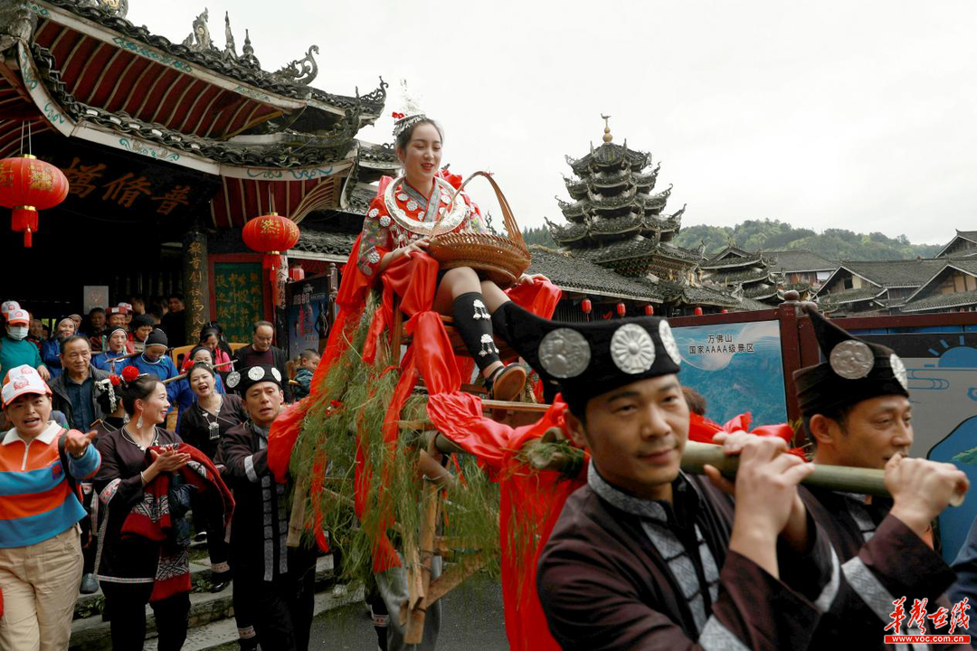 ↑侗家人吹起芦笙,抬着花轿在向游客展示侗族婚礼。刘强 潘启娟 摄影