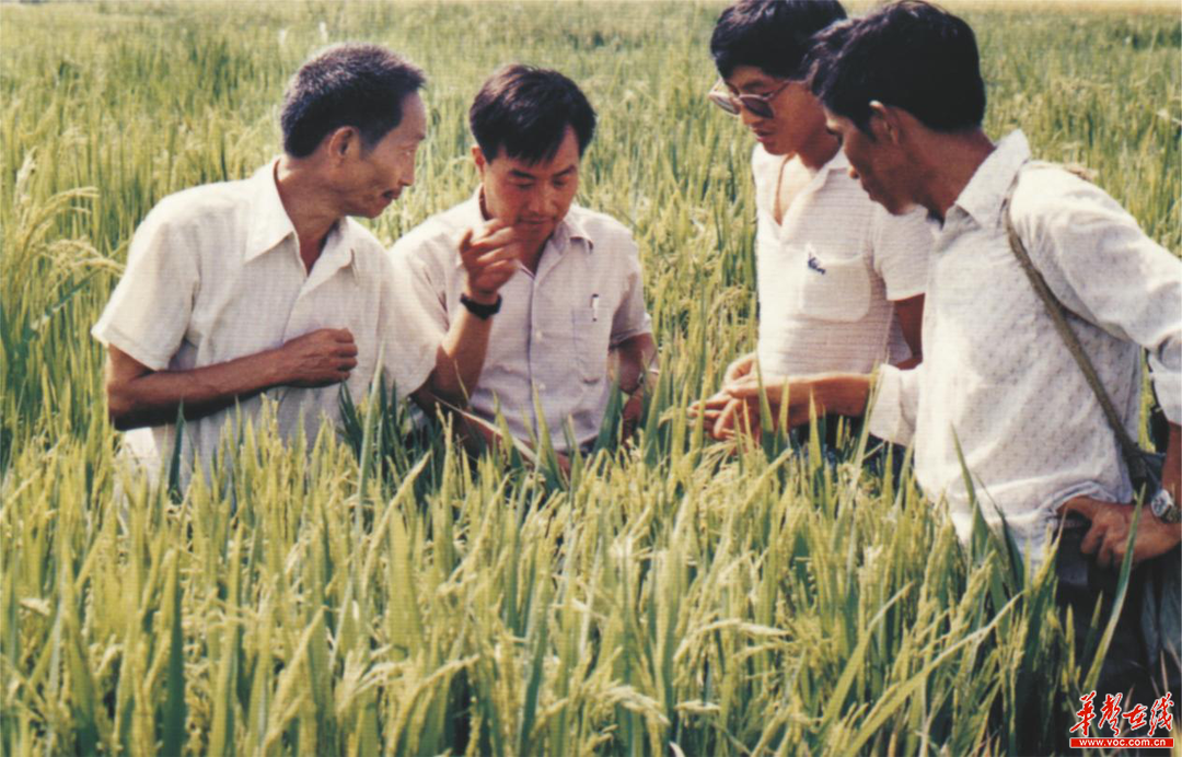 ↑1989年8月,袁隆平(左一)在田间指导邓华凤(左三)杂交水稻育种。
