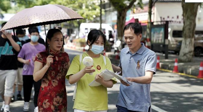 6 月 8 日下午是高考第四门英语考试的时间,33 度的高温下,长沙市一中考点外的道路上,前来送考接考的家长在树荫下默默守候着,记者采访了几位家长,了解了他们在考场之外的故事。