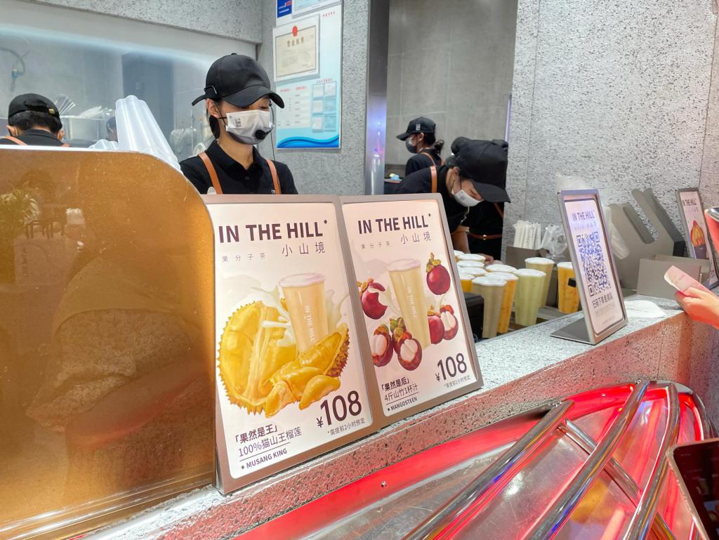 近日,一家名为 " 小山境 · 果分子茶 "(以下简称 " 小山境 ")在长沙国金街开业,吸引消费者目光的不仅是该店夸张的老虎尾巴设计,还有 108 元的猫山王榴莲饮料和 108 元的山竹饮料。