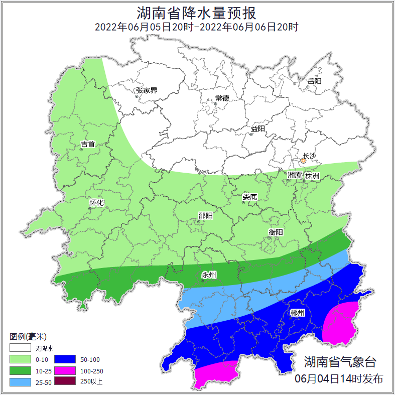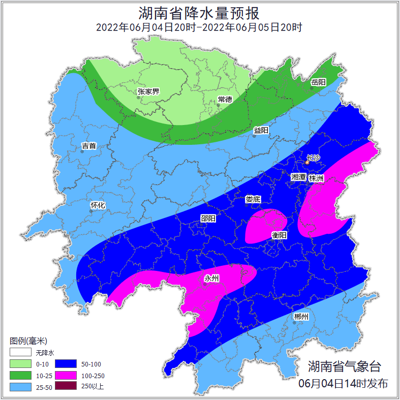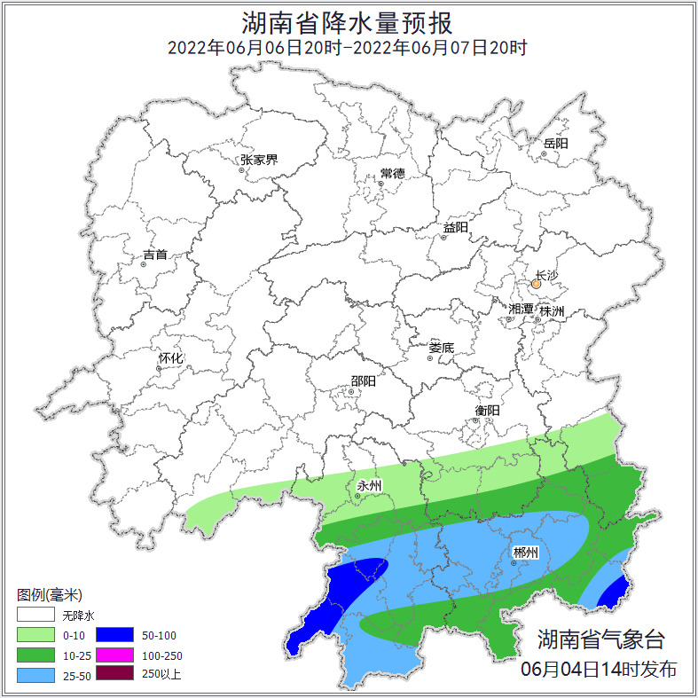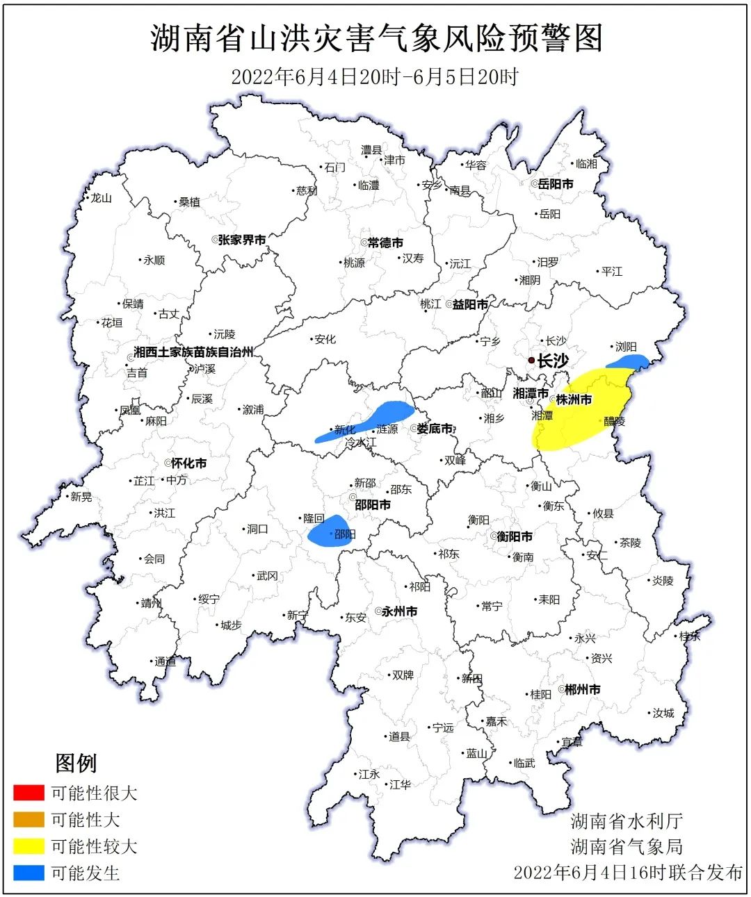 6月4日,湖南省水利厅与湖南省气象局联合发布【湖南省山洪灾害气象风险预警】:预计受降雨影响,4日20:00至5日20:00,邵阳市、娄底市、长沙市等局地可能发生山洪灾害(蓝色预警),其中,株洲市、长沙市、湘潭市等局地发生山洪灾害的可能性较大(黄色预警)。