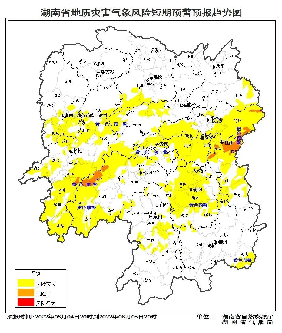 6月4日,湖南省自然资源厅与湖南省气象局联合发布【湖南省地质灾害气象风险预警】:预计自4日20:00至5日20:00 ,受降雨影响, 湘东、湘西南部分区域发生突发性地质灾害风险大(橙色预警),湘中以南大部分区域发生突发性地质灾害风险较大(黄色预警)。