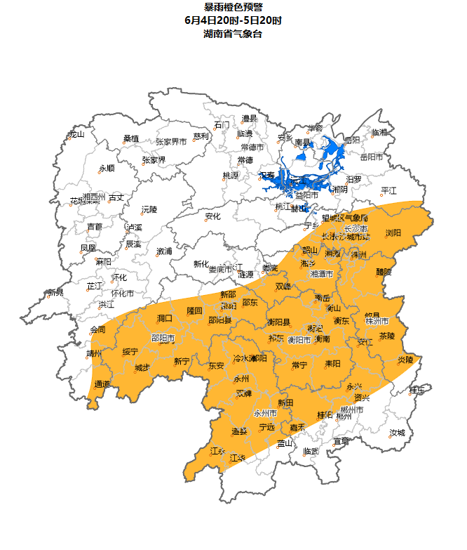 湖南省气象台6月4日16时发布【暴雨橙色预警】:预计4日20时至5日20时,长沙、株洲、湘潭、衡阳、邵阳、郴州北部、永州、娄底东部部分地区将出现暴雨,局地大暴雨,并伴有短时强降水、雷雨大风等强对流天气,请加强防范。