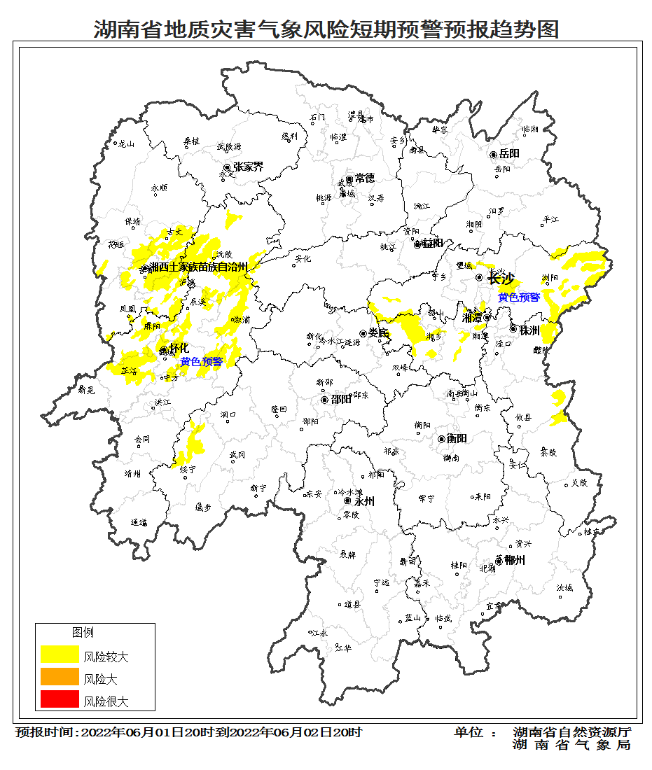 华声在线6月1日讯(全媒体记者 胡盼盼)省自然资源厅与省气象局今天联合发布地质灾害气象风险预警:预计自6月1日20时至2日20时,受降雨影响,湘东、湘西部分区域发生突发性地质灾害风险较大(黄色预警)。