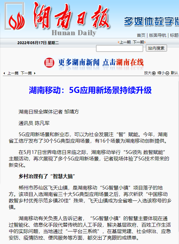 这条新闻报道的内容,是今年517电信日前湖南移动组织开展的“5G领先 数智赋能”主题采访报道活动的主要内容。2022年电信日到来之际,湖南移动用心策划,精心组织媒体深入一线,用文字、图片和视频立体展示企业在加快新型基础设施建设、提升高质量信息服务能力、引领5G应用创新发展,巩固脱贫攻坚成果、推动乡村振兴发展等方面的典型案例、重要举措和突出成效,积极展现了湖南移动践行央企三大责任、勇担网络强国、数字中国、智慧社会主力军形象。