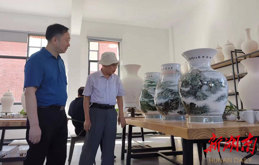 彭雪开先后考察了醴陵市左权镇左家老屋及新发现的古窑址,以及渌江书院、仙岳山风景区、湖南醴陵陶瓷研究所、1915醴陵国际陶瓷文化特色历史街区、醴陵陶瓷博物馆等文化地标及相关场所。在醴陵釉下五彩瓷非遗展览馆、中国工艺美术大师黄永平非遗传承基地、金煌瓷业车间和陶瓷艺术大师工作室,彭雪开教授一边欣赏陶瓷精品,一边了解传承创新。其与中国工艺美术大师黄永平交谈时直入主题,探讨如何发掘醴陵地名文化,赋能瓷旅深度融合一体发展。
