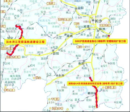 7月27日上午,湖南省京港澳高速耒阳至宜章段扩容工程、沪昆高速金醴扩容工程、沅水洪辰溪航道工程开工建设动员大会在郴州、株洲、怀化3个市州同步举行。