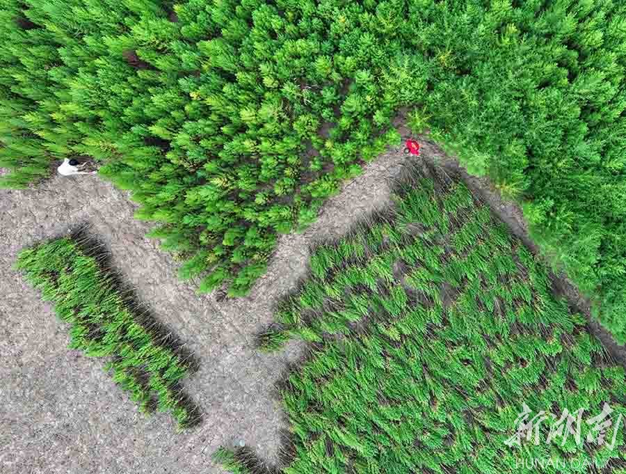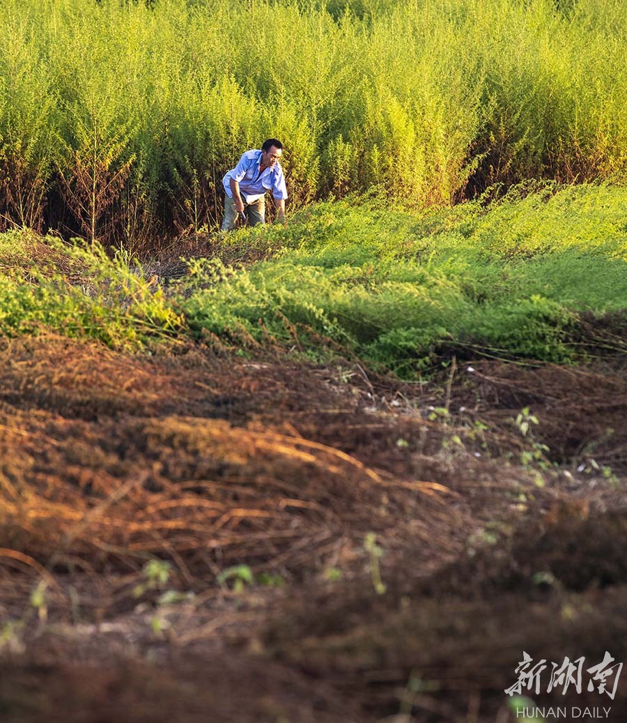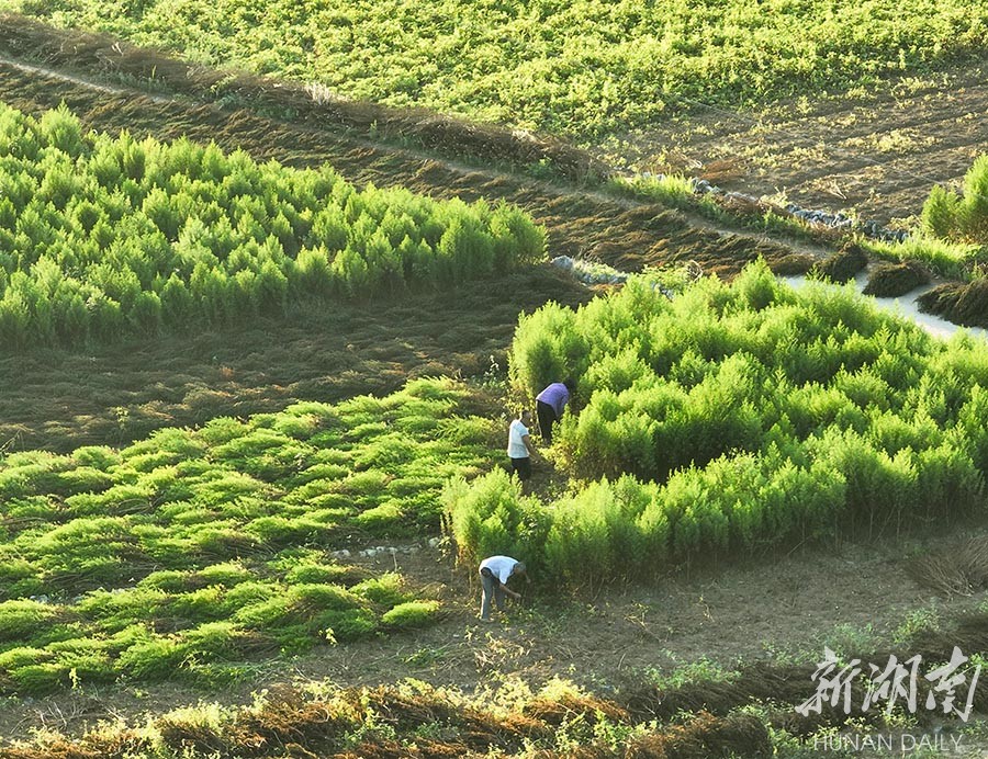 7月27日,道县乐福堂镇清塘坪村,村民在收割青蒿。时下,当地青蒿已进入收割期,村民抢抓农时收割、晾晒。近年,该县采取“公司+合作社+农户”的利益联结机制,带动全县3000户村民积极发展青蒿产业,实现增收致富。蒋克青 王一名 摄影报道