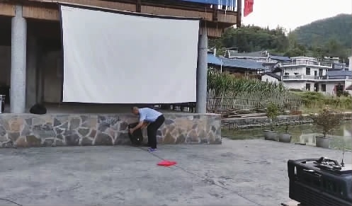牵好电线、摆好投影仪、架好幕布、连接音响……舒湘军熟练地做着放电影前的准备工作。幕布前的空地上陆续坐满了前来观看的村民,年过七旬的老人、活泼好动的小孩、忙碌了一天的男男女女……村民们默契地围聚到一起。不同于普通电影院,舒湘军的露天影院永远免费开放。