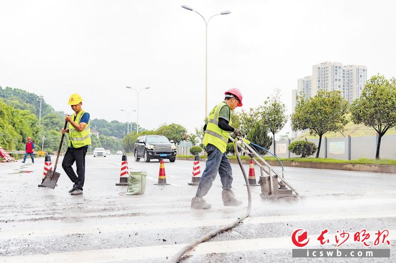 19日,工作人员在黄桥大道上铲除部分过密的减速带。长沙晚报全媒体记者 邹麟 实习生易斯陶 摄影报道